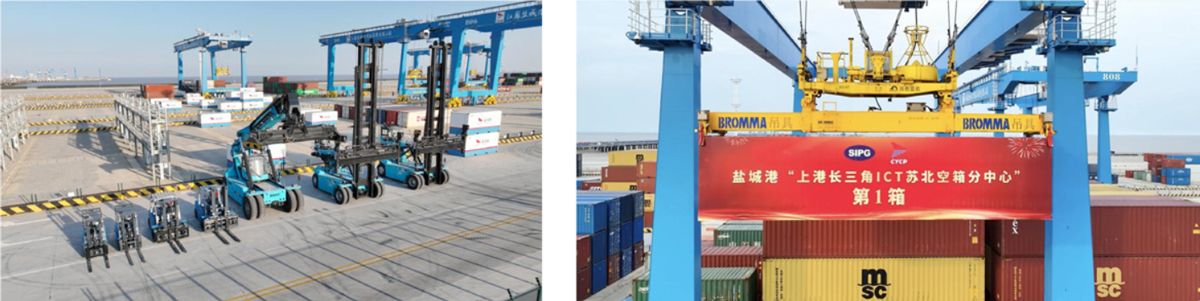 2024年7月,滬鹽兩港合作成立“上港長三角蘇北20萬標箱ICT空箱分中心”,年空箱周轉能力達20萬標箱,提供便捷提還箱服務,與“滬鹽專線”協同引導企業“陸改水”,提高“鹽貨鹽運”比例。