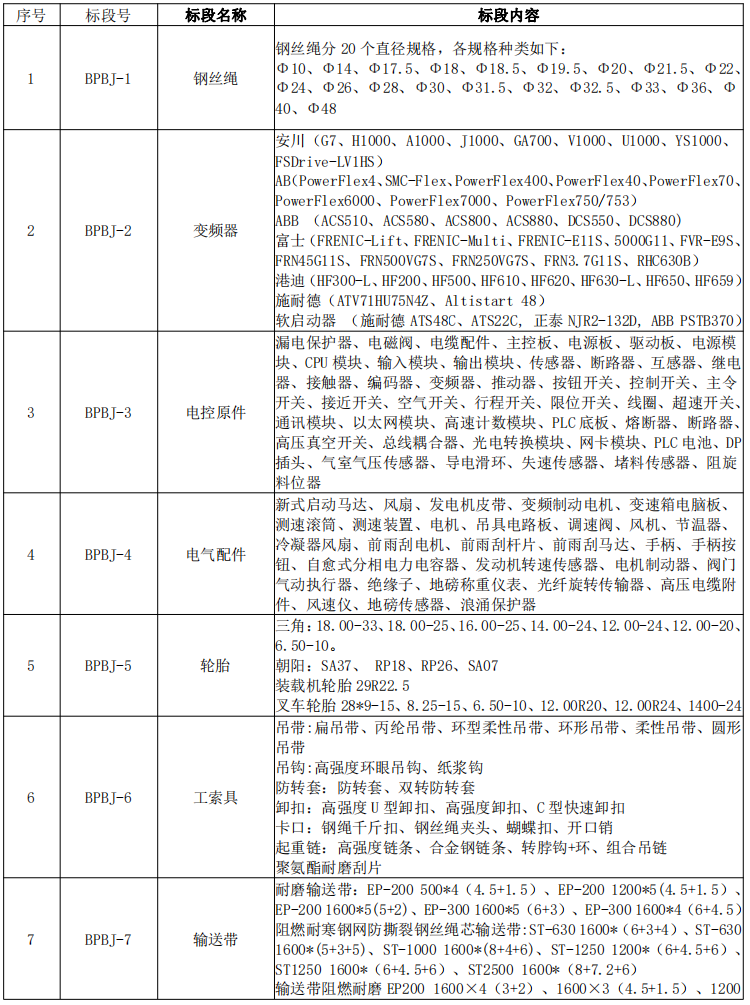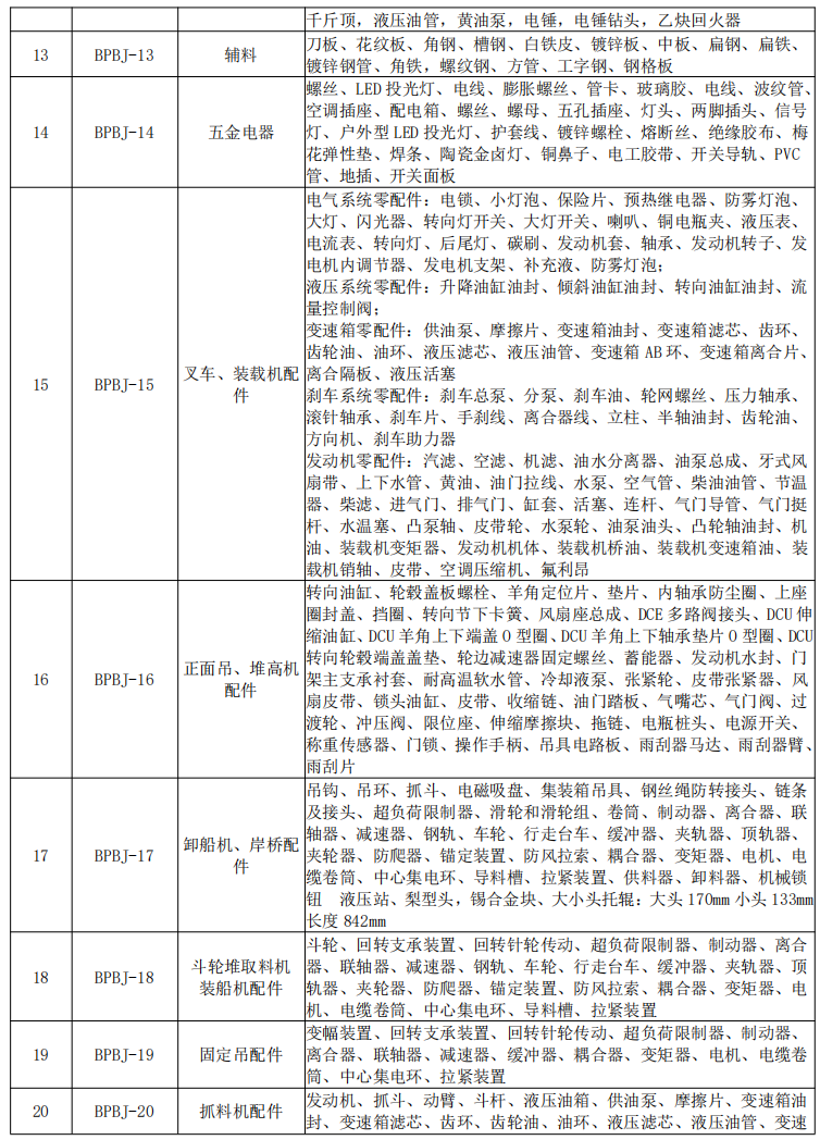 A部分:維修材料備品備件。招標(biāo)范圍:為江蘇鹽城港控股集團(tuán)有限公司2023年港口設(shè)備維修材料備品備件提供采購、運(yùn)輸、驗收、售后服務(wù)等服務(wù)工作,共分為?20 ?個標(biāo)段,具體情況如下: