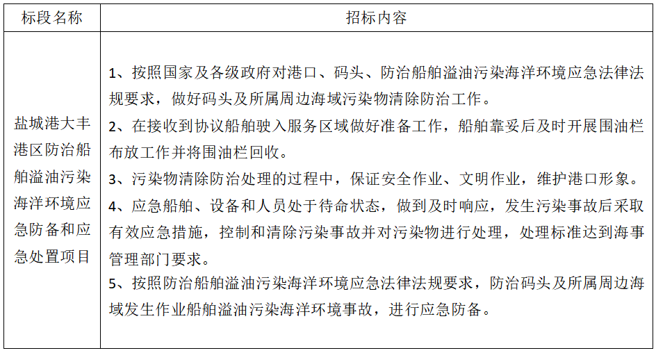 1、項(xiàng)目名稱(chēng):鹽城港大豐港區(qū)防治船舶溢油污染海洋環(huán)境應(yīng)急防備和應(yīng)急處置項(xiàng)目