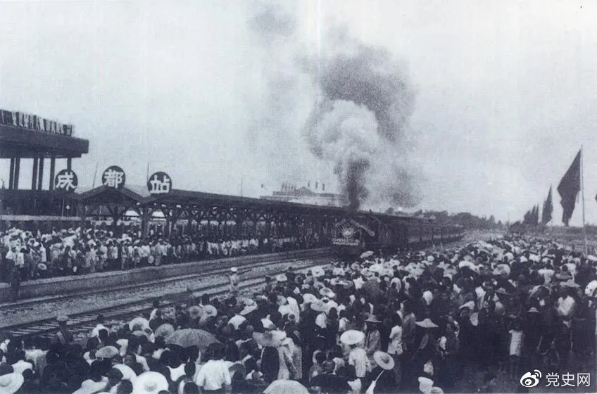 新中國成立后,在短短的兩年內(nèi)就建成了成渝鐵路。圖為1952年7月1日由成都開出的第一列火車。