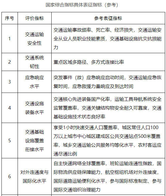 為深入貫徹落實(shí)《交通強(qiáng)國建設(shè)綱要》《國家綜合立體交通網(wǎng)規(guī)劃綱要》,客觀評估交通強(qiáng)國建設(shè)進(jìn)程,充分發(fā)揮評價指標(biāo)體系的“標(biāo)尺”和“指揮棒”作用,科學(xué)引導(dǎo)各地區(qū)、各行業(yè)加快建設(shè)交通強(qiáng)國,我們研究制定了《交通強(qiáng)國建設(shè)評價指標(biāo)體系》,經(jīng)報國務(wù)院領(lǐng)導(dǎo)同志同意,現(xiàn)予印發(fā)。