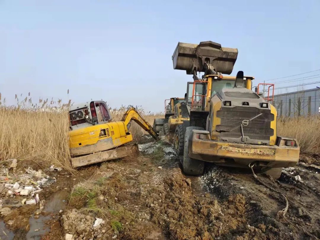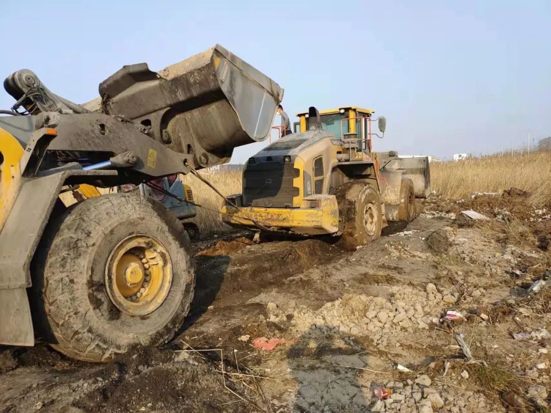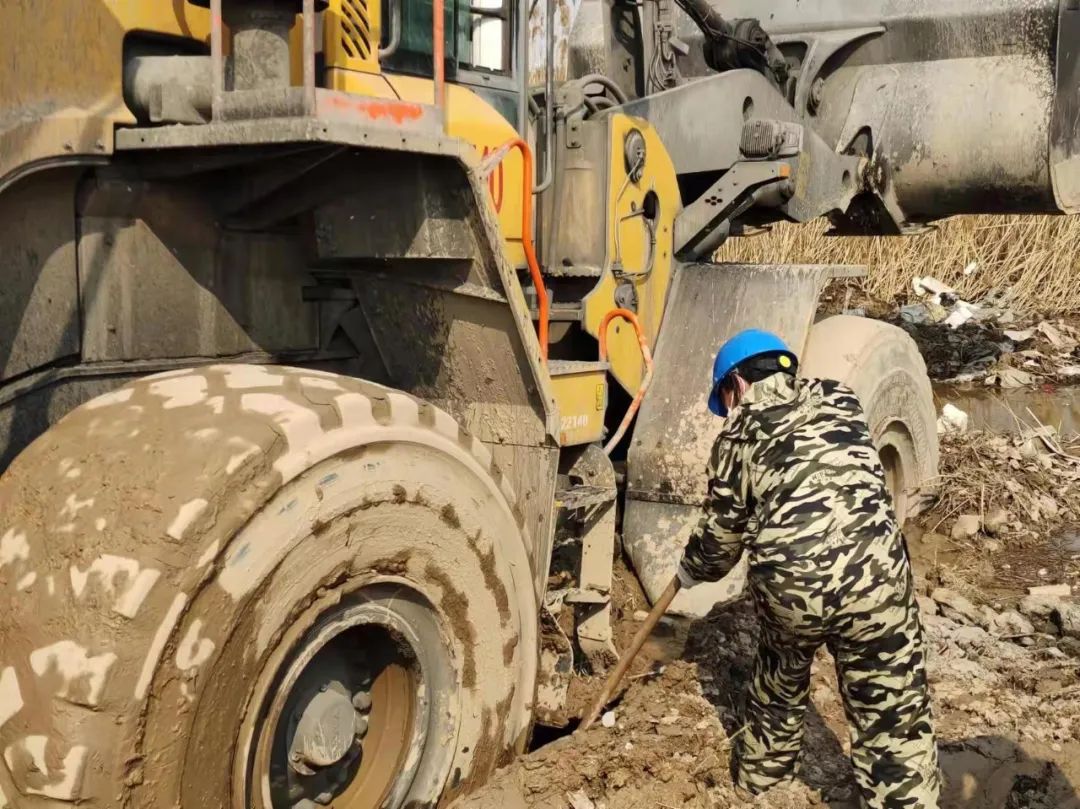 面對連續(xù)的失敗,響水港區(qū)團(tuán)隊(duì)再次展現(xiàn)出了百折不撓,迎難而上的港口工匠精神,深刻剖析前兩次失敗原因,再次調(diào)集一臺小型挖機(jī)對事件車輛輪子周邊淤泥進(jìn)行清理,回填石子提升其自身摩擦力,同時(shí)針對涉險(xiǎn)裝載機(jī)陷入太深可能造成底盤擱置等情況,調(diào)配一輛裝載機(jī)協(xié)助抬升予以解決,并再次調(diào)集一輛裝載機(jī)采用接力模式增加牽引力。經(jīng)過多臺機(jī)械的通力配合,受困裝載機(jī)終于在拖拽中緩緩駛出泥潭,圓滿完成救援工作。