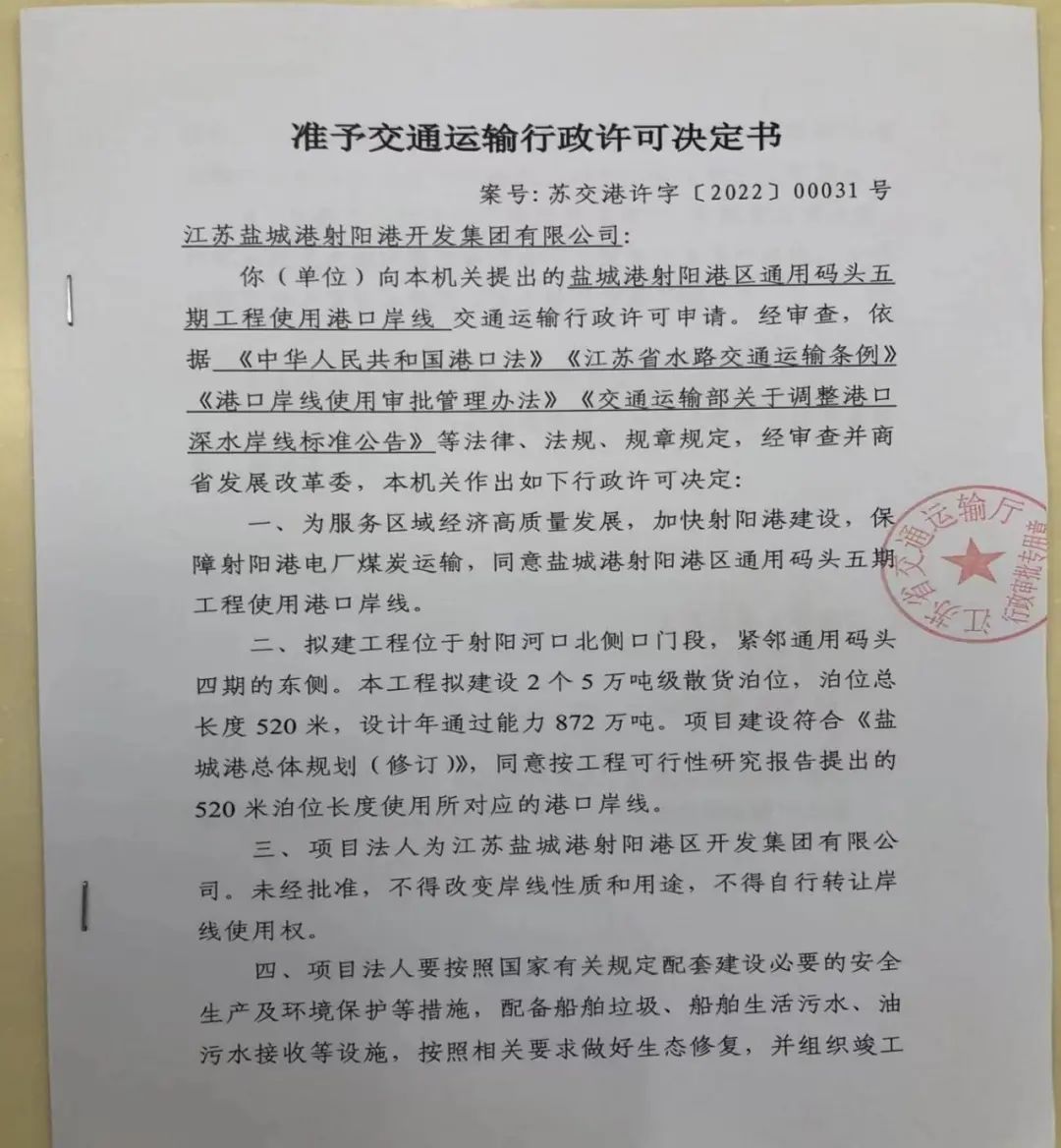 9月16日,鹽城港射陽港區(qū)通用碼頭五期工程岸線取得江蘇省交通運(yùn)輸廳正式批復(fù)。截至目前,該項(xiàng)目前期工可報(bào)告、穩(wěn)評、通航安全技術(shù)報(bào)告、防洪評價、岸線全部通過批復(fù),這標(biāo)志著項(xiàng)目開工正式邁入“快車道”。