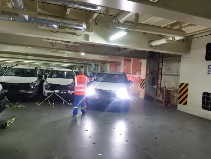 業務開展期間,工作人員密切配合,對每臺車輛進行固定和檢查,熟練地進行綁扎工作,確保車輛在運輸過程中不會發生絲毫移動,仔細查驗車輛的外觀和內部設備,不放過任何一個可能存在的問題,同時安排專人專崗緊盯作業流程,嚴格把關汽車裝船及加固作業,反復檢查每一個螺栓的緊固程度、每一根繩索的拉力大小,確保萬無一失,將高標準作業貫穿于卸車、驗車、收車、裝船、加固等各個環節。