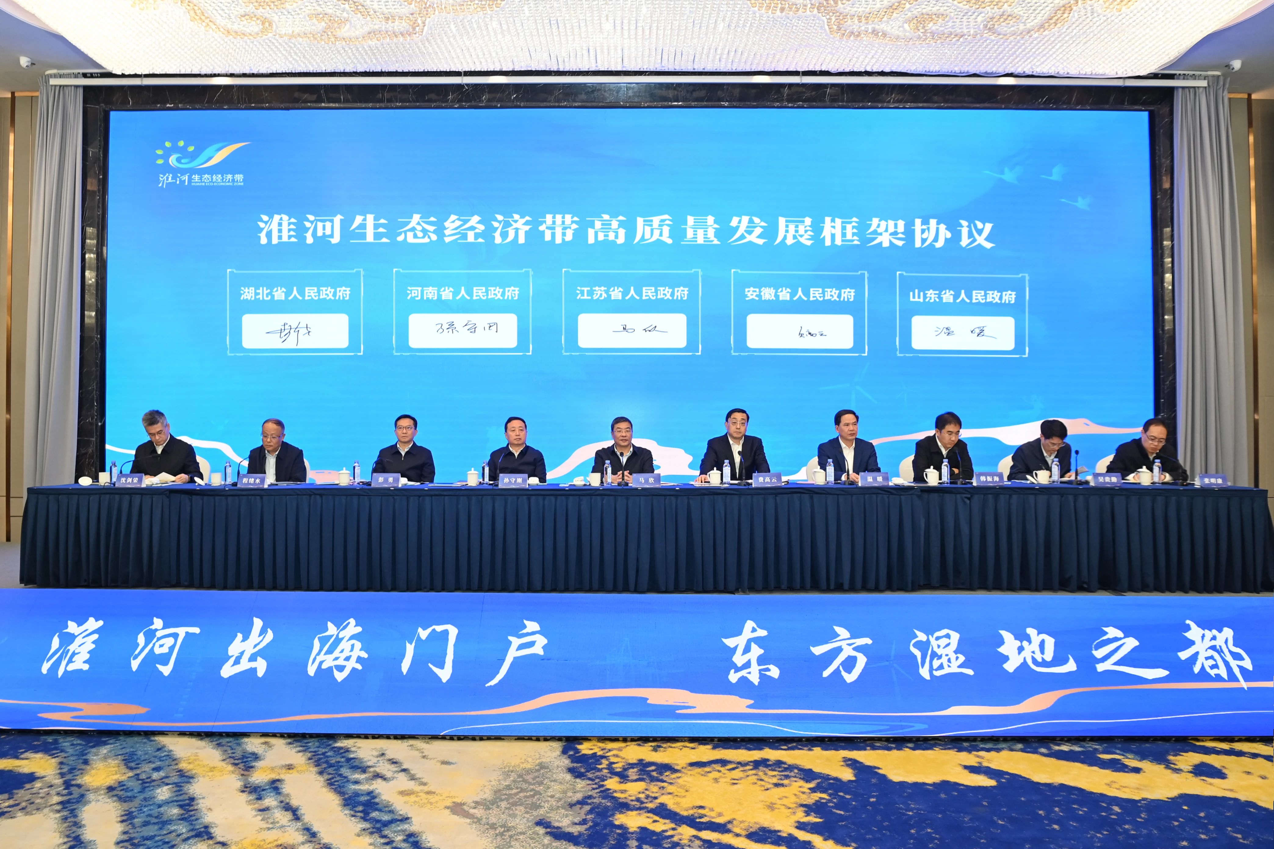 會上,五省領導圍繞貫徹落實黨的二十屆三中全會提出的“構建跨行政區合作發展新機制”,深度融入和服務國家區域重大戰略和區域協調發展戰略,分別作了講話,審議了2024—2025年度《淮河生態經濟帶省際重點合作事項》,并簽署了《關于進一步協同推進淮河生態經濟帶高質量發展的框架協議》。