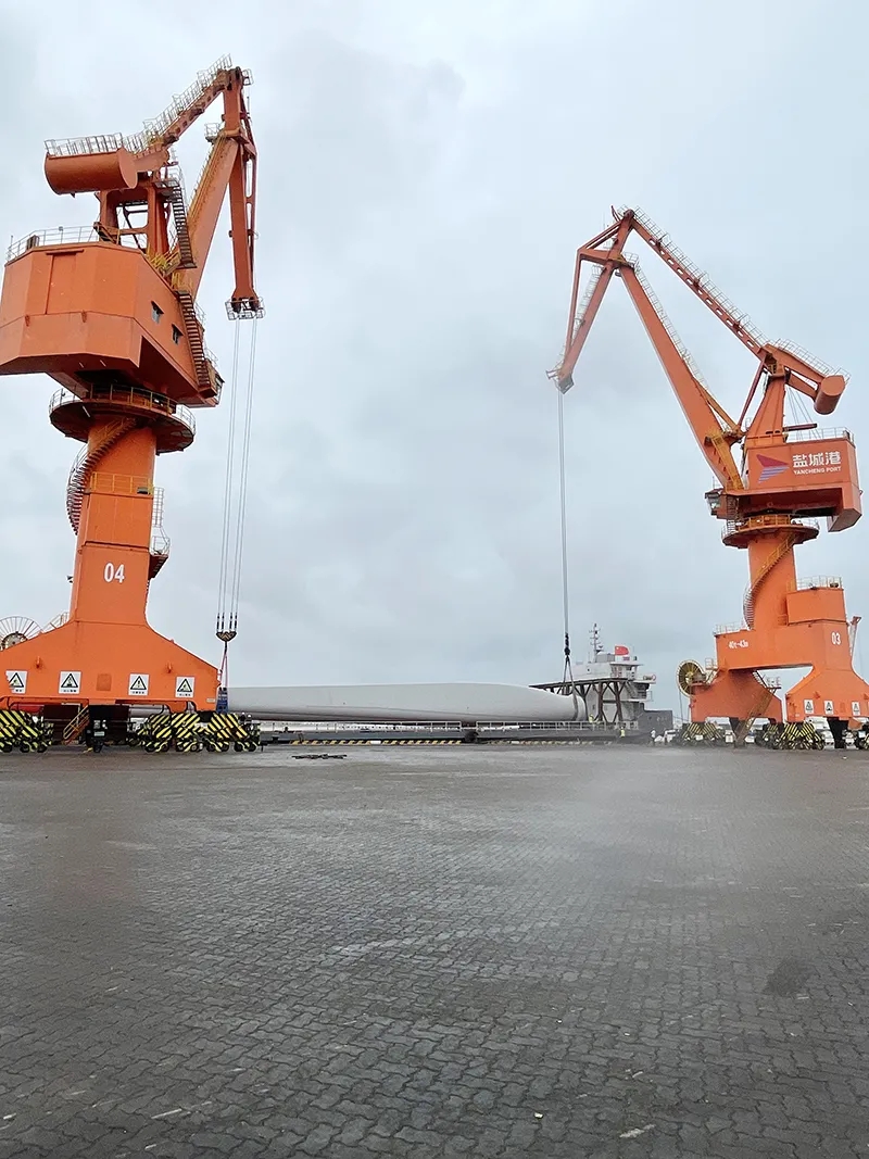據(jù)悉,此次2套大型風(fēng)電葉片采用門座式起重機(jī)的作業(yè)方式裝卸,風(fēng)電葉片各長(zhǎng)71.4米,兩套總重達(dá)280噸,該批次風(fēng)電葉片將從濱海港區(qū)裝船啟運(yùn)至浙江岱山機(jī)位項(xiàng)目處。