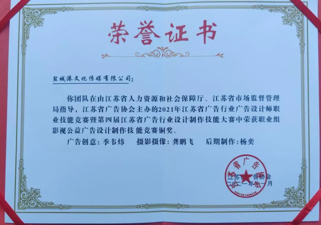 11月28日,從2021年江蘇省廣告行業(yè)廣告設(shè)計(jì)師職業(yè)技能競(jìng)賽暨第四屆設(shè)計(jì)制作技能大賽上傳來好消息,由江蘇鹽城港文化傳媒有限公司選送的參賽選手,經(jīng)過現(xiàn)場(chǎng)理論、實(shí)際創(chuàng)作等環(huán)節(jié)的比拼,在此次省級(jí)一類大賽中分別獲得職業(yè)組平面公益廣告設(shè)計(jì)銅獎(jiǎng)、職業(yè)組影視公益廣告設(shè)計(jì)制作銅獎(jiǎng),為公司進(jìn)一步提升品牌影響力增添了濃墨重彩的一筆,為“50天大比武活動(dòng)”交上了一份優(yōu)異的答卷。