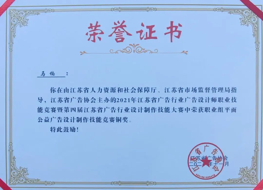 此次大賽是第四屆江蘇省百萬技能人才技能競(jìng)賽崗位練兵活動(dòng)其中一項(xiàng)重要賽事,由江蘇省人力資源和社會(huì)保障局、江蘇省市場(chǎng)監(jiān)督管理局、江蘇省廣告協(xié)會(huì)聯(lián)合舉辦,以“永遠(yuǎn)跟黨走”競(jìng)賽主題,內(nèi)容包含廣告專業(yè)理論知識(shí)考試和技能實(shí)操競(jìng)賽,來自全省各市區(qū)130多支代表隊(duì)參加角逐。其中,文化傳媒公司5名參賽選手在理論知識(shí)考試和技能實(shí)操競(jìng)賽成績中取得優(yōu)異成績,均獲得三級(jí)廣告設(shè)計(jì)師職業(yè)技能等級(jí)證書。