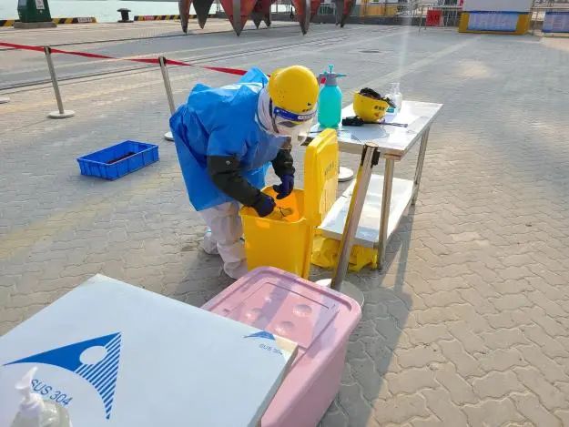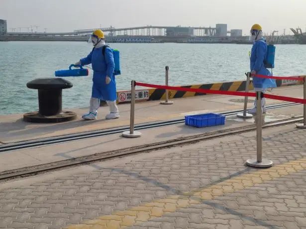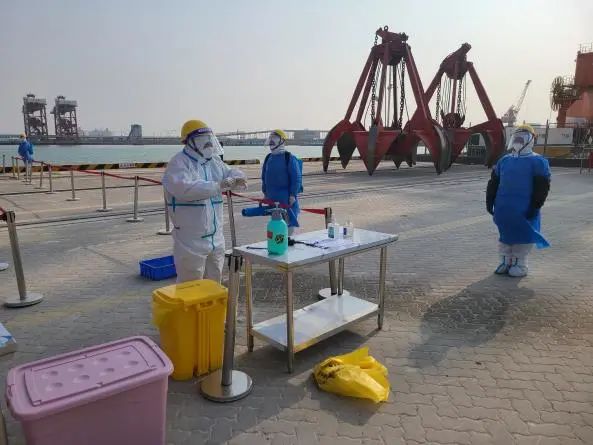 本次演練模擬了濱海港區通用碼頭2號泊位發現疫情之后的相關處置流程。演練中,碼頭發現疫情后,及時將情況進行上報,并立即停止作業,同時迅速對登船人員進行排查,就地隔離,開展現場消殺工作。現場成立疫情防控應急指揮部,按照指揮部的統一調度,開展應急處置,經過妥善處理,演練中的疫情得到有效控制,同時對碼頭作業人員嚴格執行“N+7+7”的閉環管理,確保濱海港區碼頭盡快恢復正常生產。
