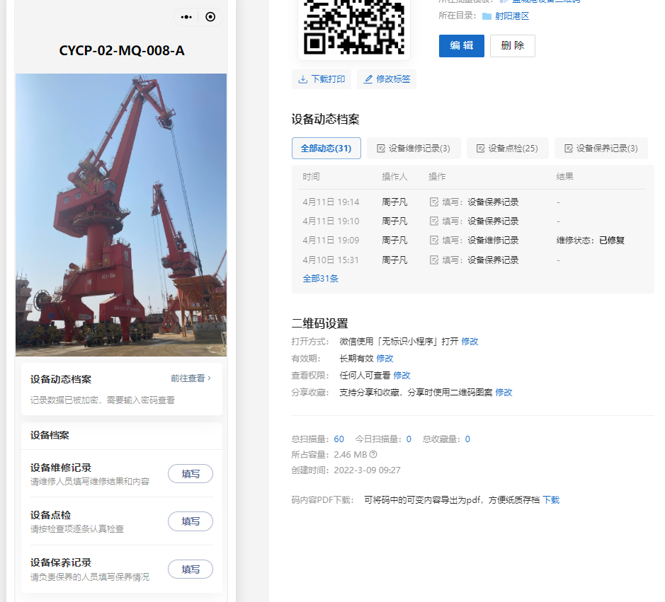 現(xiàn)場維護(hù)保養(yǎng)人員通過掃描港口設(shè)備上的二維碼,即可將設(shè)備維修、點(diǎn)檢和保養(yǎng)記錄錄入設(shè)備二維碼中,后臺數(shù)據(jù)實時更新,管理人員可隨時隨地查看全集團(tuán)港口設(shè)備的運(yùn)行情況,實現(xiàn)集團(tuán)集中掌握全部港口設(shè)備的運(yùn)行狀態(tài),提升了設(shè)備管理效率,對出現(xiàn)的問題能夠及時解決。同時,利用大數(shù)據(jù)匯總分析設(shè)備的整體狀態(tài),可以對設(shè)備后期的采購、維護(hù)保養(yǎng)提供一定建議。