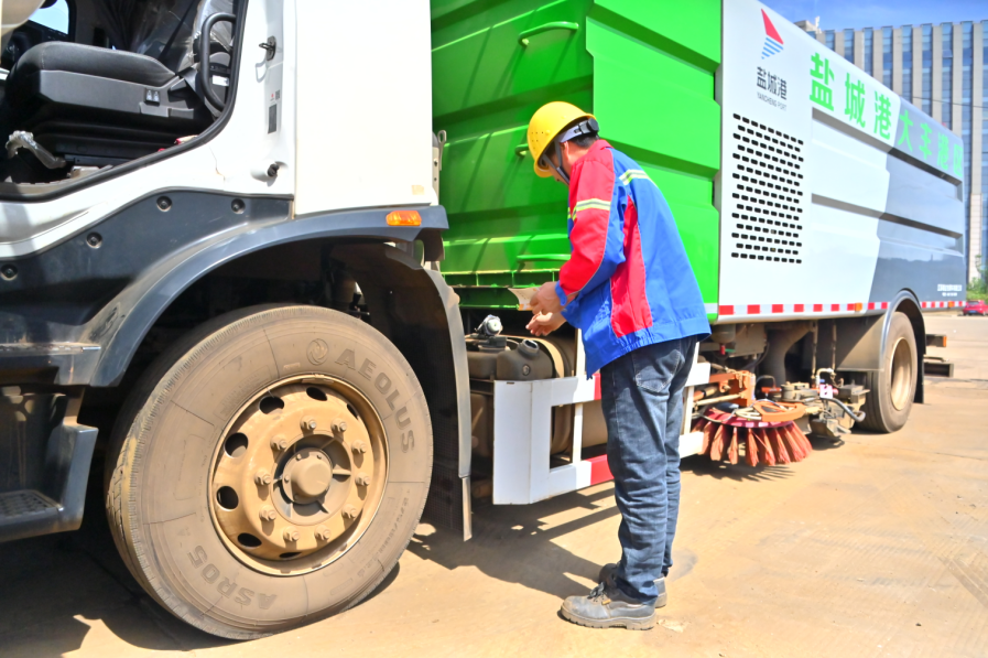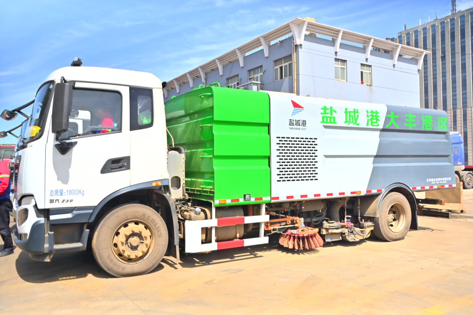 Hi!大家好。我是來自鹽城港港口公司的一臺環保洗掃車,別看我和普通環保車的外觀差不多,我的工作任務可和它們不一樣,我每天要對鹽城港大豐港區道路進行洗掃作業和防塵抑塵。我是清潔工作中的好幫手,每天都讓港區恢復煥然一新。