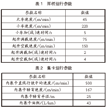 堆場仿真參數:2.1 堆場布局參數港口裝卸作業區布置2個10萬噸級泊位,每個泊位配備3臺岸橋,總計6臺岸橋,編號分別為Crane 1、Crane 2、Crane 3、Crane 4、Crane 5、Crane 6。港口堆場作業區規劃有4個箱區,編號分別為E01、E02、E03、E04。在堆場布置方面,E01箱區為近海側箱區,E04箱區為近陸側箱區,E01、E02箱區為出口箱區,E03、E04箱區為進口箱區。在港口堆場作業區規劃中,將E01箱區設置為9列5層箱區,E02、E03、E04箱區設置為12排5層箱區,每個箱區配備有2臺場橋協同作業,總計8臺場橋,編號分別為A01、A02、A03、A04、A05、A06、A07、A08。2.2 堆場設備參數港口堆場作業設備主要包括場橋、岸橋、集卡等,上述設備的運行參數即為堆場仿真系統的輸入參數。根據實際集裝箱堆場作業數據,對作業設備進行參數設置。岸橋運行參數見表1,集卡運行參數見表2,場橋運行參數見表3。