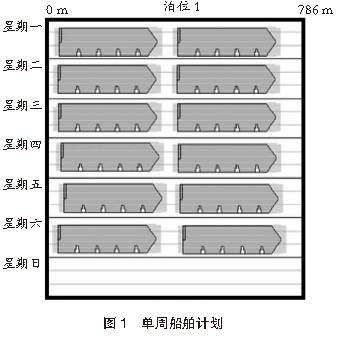 2.3 船舶泊位參數根據港口提供的實際船舶和泊位規格參數,建立船舶精確模型和簡化模型,具體模型按照現場作業需求和仿真系統實際運行情況進行選擇。為了對港口堆場作業進行有效的仿真分析,在設置泊位參數時,優先考慮實際作業過程中最大泊位通過能力。按照單周作業計劃進行工況設定,單周計劃作業船舶12艘,單艘船舶裝箱量為420~ 530 TEU,卸箱量為420~530 TEU。單周船舶計劃見圖1。