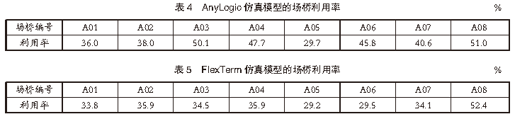 4仿真結果分析利用港口自動化堆場相關數據,分別對基于AnyLogic軟件和FlexTerm軟件的堆場系統仿真模型的仿真結果進行對比分析。4.1 場橋利用率對比在集裝箱堆場作業中,場橋是提高堆場作業效率的關鍵因素。合理分析場橋利用率對提高堆場作業效率、減少船舶在港停泊時間尤為重要。根據港口提供的堆場作業參數和實際堆場作業的場橋利用情況,對堆場內場橋使用情況進行仿真對比分析。AnyLogic仿真模型的場橋利用率見表4,FlexTerm仿真模型的場橋利用率見表5,2種仿真模型的場橋利用率對比見表6。