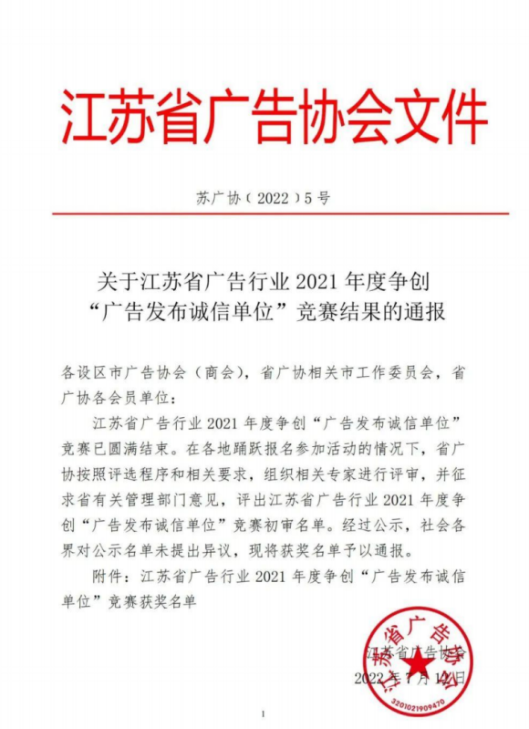 7月16日,2021年度江蘇省廣告行業廣告發布誠信單位評選結果公布,江蘇鹽城港文旅集團文化傳媒公司再獲榮譽稱號。