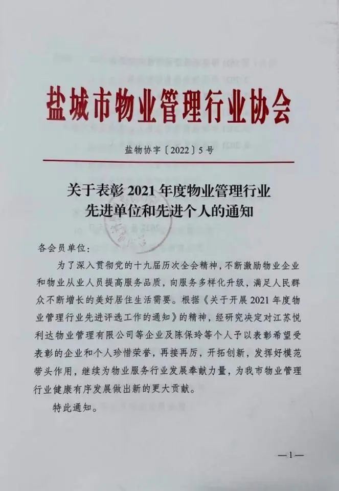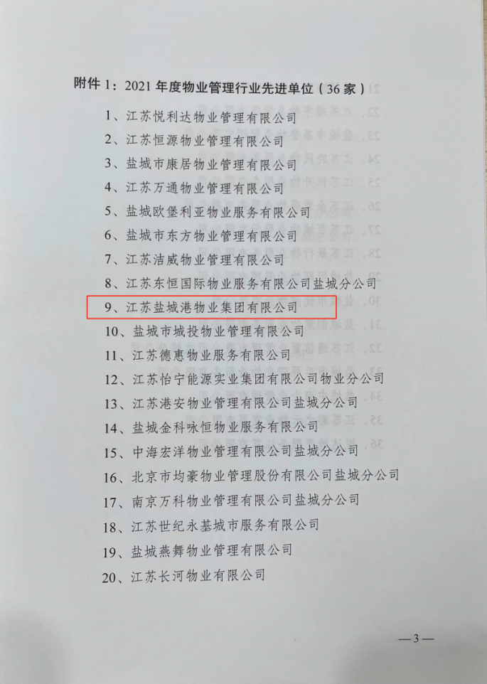 近日,鹽城市物業(yè)管理行業(yè)協(xié)會(huì)對全市物業(yè)管理行業(yè)先進(jìn)單位和先進(jìn)個(gè)人進(jìn)行了表彰,江蘇鹽城港物業(yè)集團(tuán)有限公司獲評“2021年度物業(yè)管理行業(yè)先進(jìn)單位”榮譽(yù)稱號。
