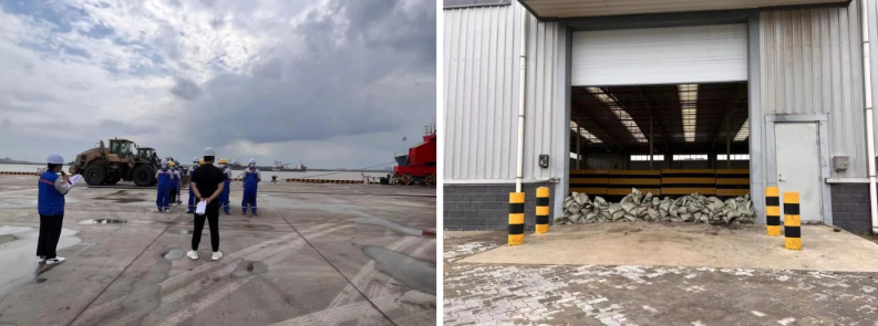 演練模擬安全環保部人員接到上級氣象災害預警通知,我區域將出現強降水、8級以上雷暴大風極端天氣。接到通知后,相關部門立即停止室外作業,緊急啟動《防臺防汛應急預案》。門機防風演練現場,應急演練人員打開隱藏式坑位蓋板,門機移機定位、下錨定插板、加固防風拉索,快速完成單臺門機防風加固任務。物流園防汛演練現場,搶險人員對室外堆場進行針對性排水,并用沙袋將倉庫、配電房等重點部位進行封堵,迅速完成防洪墻堆建。