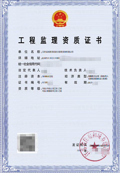 2022年11月18日,項目管理公司獲得由江蘇省住房和城鄉建設廳頒發的“房屋建筑工程乙級和市政公用工程乙級”兩項工程監理資質證書,標志著公司資質申辦工作取得重大進展,對提升公司品牌影響力,提高市場競爭力具有重要的意義。