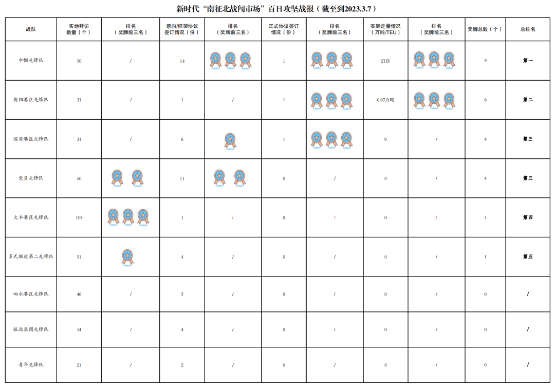 1.累計拜訪客戶數量523家:其中大豐港區先鋒隊103家,黨員先鋒隊56家,多式聯運第二先鋒隊51家,巾幗先鋒隊50家,建湖港區先鋒隊49家,響水港區先鋒隊46家,射陽港區先鋒隊31家,濱海港區先鋒隊31家,亭湖港區先鋒隊29家,多式聯運第一先鋒隊24家,青年先鋒隊21家,阜寧港區先鋒隊18家,航運集團先鋒隊14家。