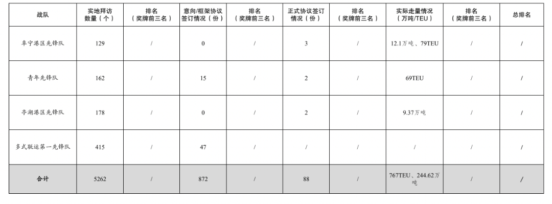 活動開展以來,累計拜訪客戶數量5262家,簽訂意向/框架協議數量872份,簽訂正式協議88份,實際走量767TEU、244.62萬噸。