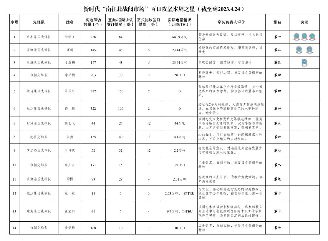第二名:濱海港區先鋒隊 高鵬(拜訪客戶145家,簽訂意向協議46份,簽訂正式協議5份,實際走量23.44萬噸)