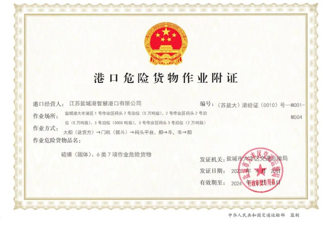 4月27日下午,經(jīng)交通部門正式批準(zhǔn),鹽城港大豐港區(qū)集裝箱碼頭順利取得港口危險貨物作業(yè)附證,標(biāo)志著鹽城港集裝箱產(chǎn)業(yè)正式具備危險貨物作業(yè)能力。