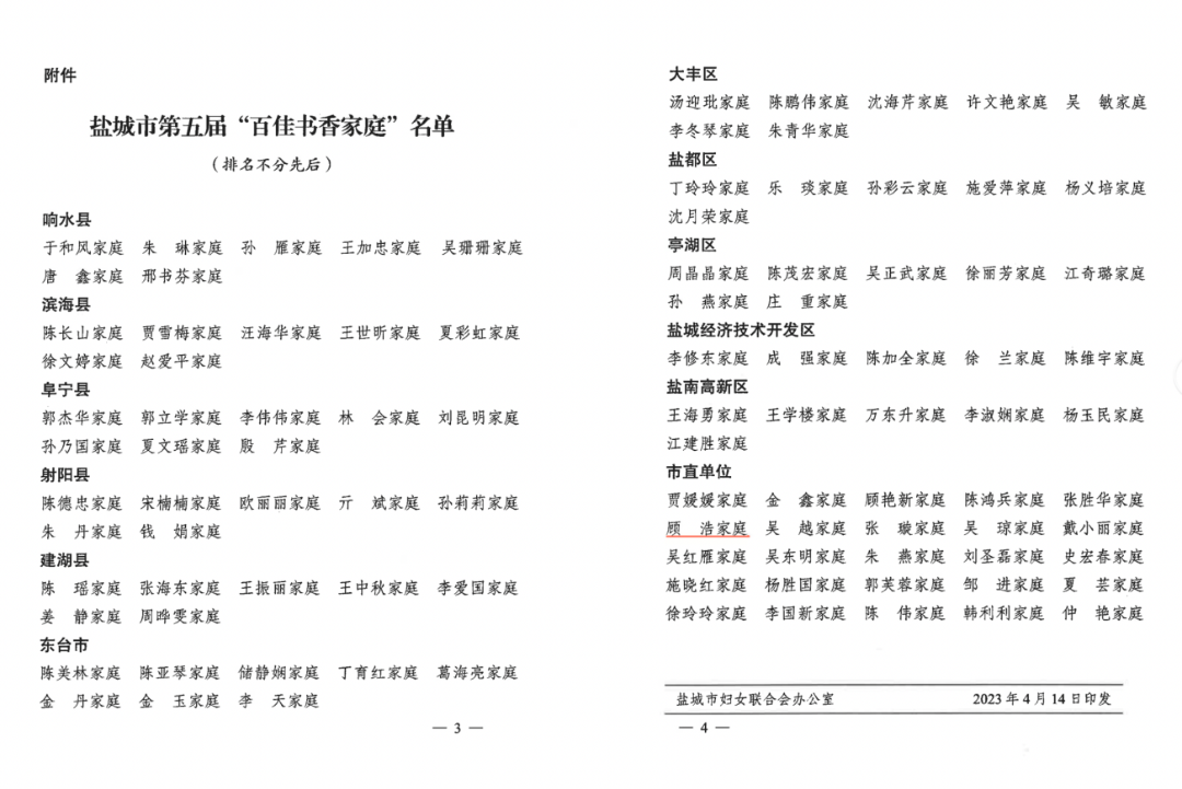 近日,從鹽城市婦女聯(lián)合會(huì)傳來好消息,在市第五屆“百佳書香家庭”評(píng)選活動(dòng)中,集團(tuán)下屬公司大豐港集團(tuán)成品油公司職工顧浩家庭榮獲鹽城市“百佳書香家庭”稱號(hào)。
