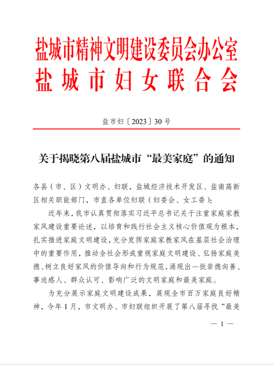近日,從鹽城市婦女聯(lián)合會(huì)傳來好消息,在市第八屆鹽城市“最美家庭”評(píng)選活動(dòng)中,鹽城港響水港區(qū)曾軍家庭榮獲鹽城市“最美家庭”稱號(hào)。