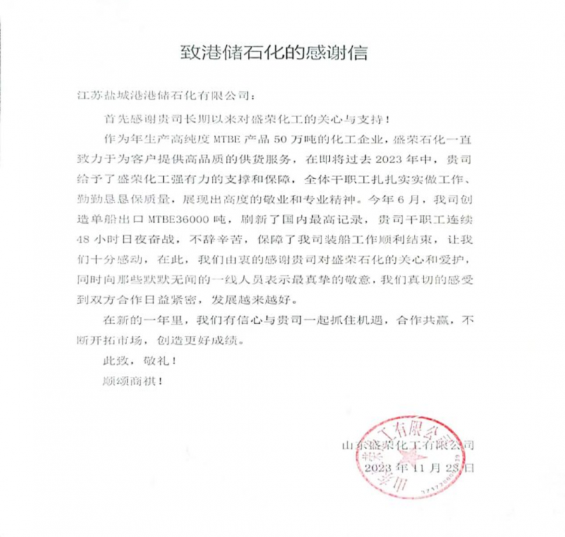 今年以來港儲(chǔ)石化公司全體干部職工堅(jiān)持以“時(shí)間就是金錢,程序體現(xiàn)規(guī)矩,質(zhì)量鑄就精品,效率就是生命”為宗旨,不斷提升服務(wù)品質(zhì)及工作效率,獲得了客戶的贊賞與肯定。近期,合作客戶山東玉皇盛榮化工寄來一封感謝信,信中內(nèi)容充分肯定了港儲(chǔ)石化的服務(wù)品質(zhì),并由衷地表達(dá)了感謝。