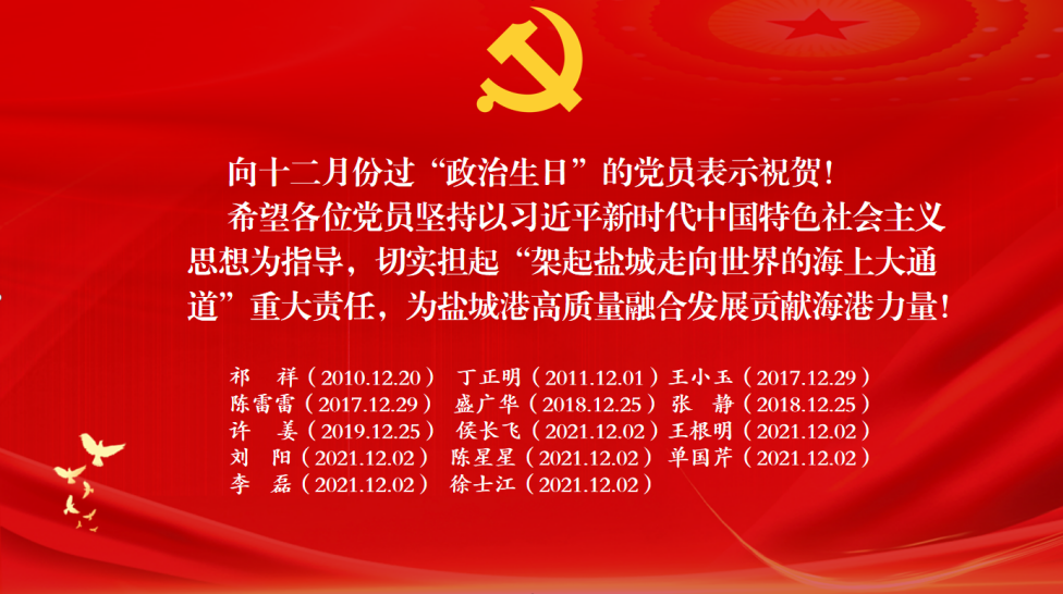 一個承諾,一顆初心,一生信仰,我心向黨,初心永摯。射陽港區全體黨員干部將永葆共產黨員的政治本色,堅定信仰鑄忠誠,立足崗位創新功。在新的一年里。射陽港區黨總支也將用活“政治生日”形式,與支部書記上黨課、實境教育相結合,讓全體干部職工感受到集團黨委、港區黨組織的溫暖關懷。