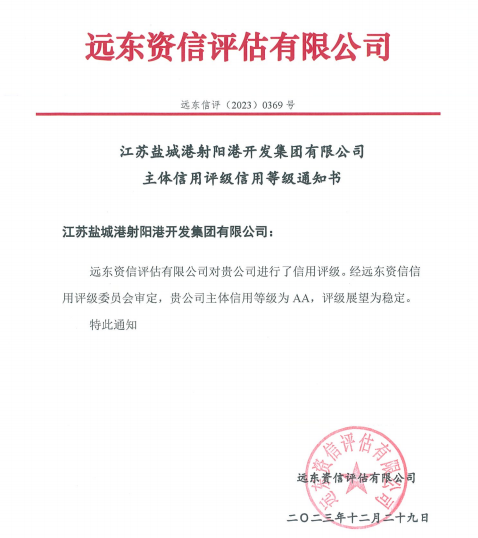 近日,遠東資信信用評級委員會審定,江蘇鹽城港射陽港開發(fā)集團有限公司成功獲得AA主體信用評級,評級展望為穩(wěn)定。這是江蘇鹽城港射陽港開發(fā)集團有限公司近年來取得的又一耀眼的成績。