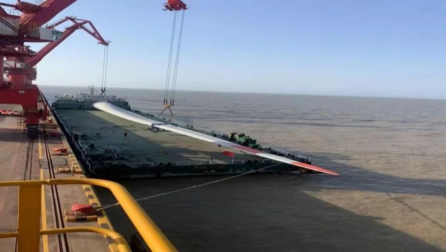 近日,在鹽城港大豐港區(qū)通用碼頭2#泊位上演了一場風(fēng)電葉片的吊裝大片。兩套116米巨龍般的風(fēng)電葉片,隨著吊裝繩索穩(wěn)穩(wěn)吊放在“盛達(dá)98”輪甲板上,標(biāo)志著本次風(fēng)電葉片作業(yè)任務(wù)順利完成,起航運(yùn)往廣西防城港。
