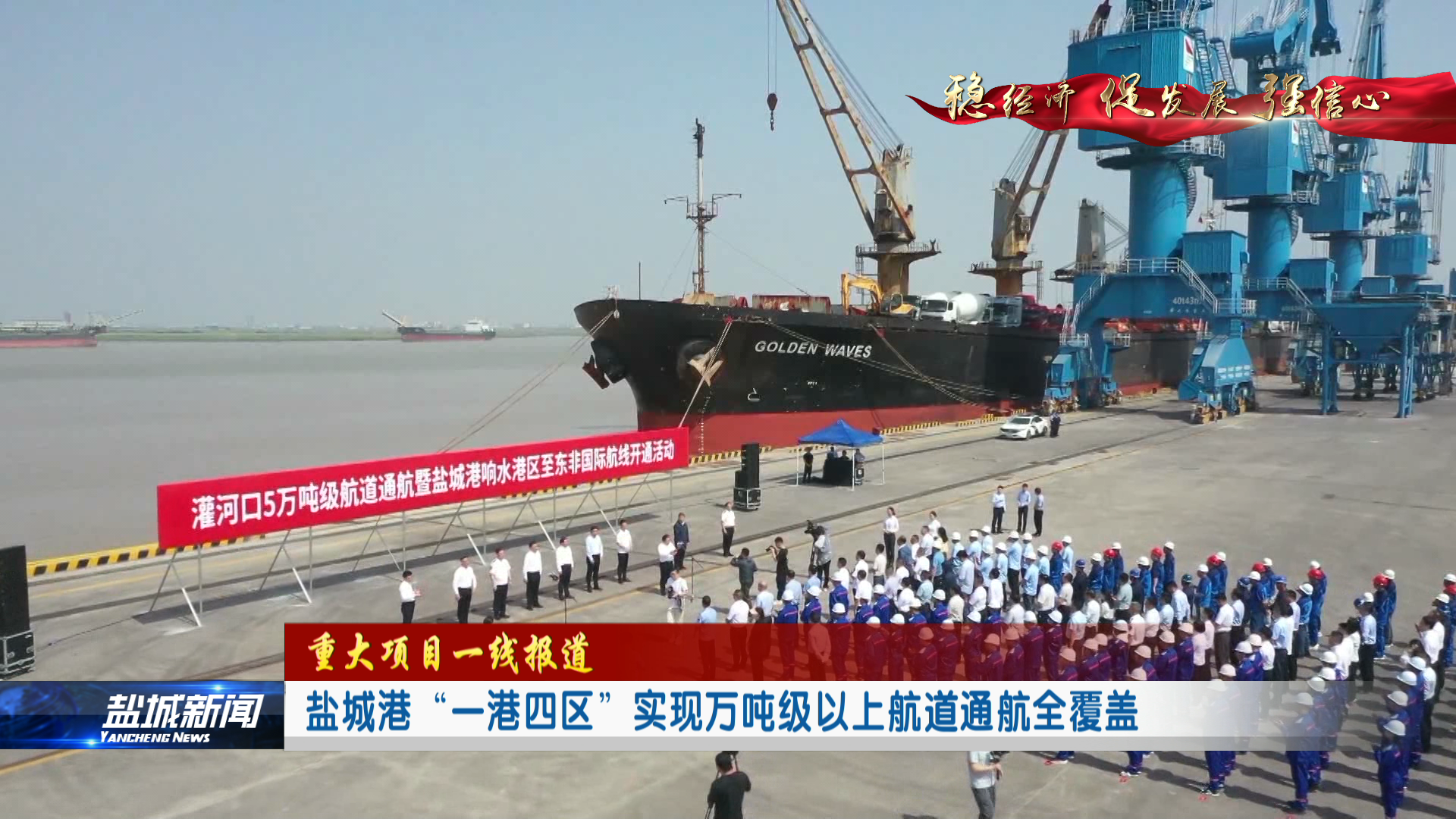 6月13日上午,隨著一陣鳴笛聲,停泊在響水港區5號碼頭的5萬噸級金波輪整裝待發,即將開始它的東非之旅。這標志著灌河口5萬噸級航道暨鹽城港響水港區至東非國際航線正式通航,為鹽城走向世界海上大通道描上厚重的一筆。