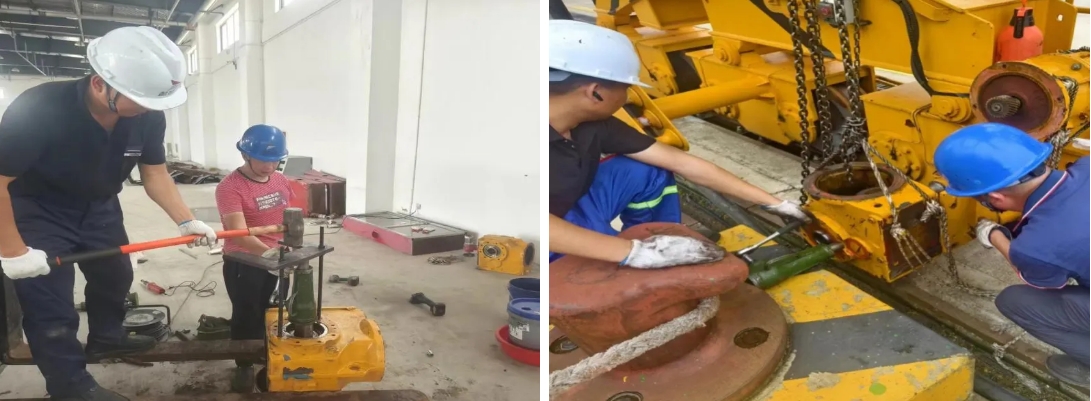 一線(xiàn)現(xiàn)場(chǎng),總能看到港機(jī)公司維保人員忙碌的身影。在接到建湖港區(qū)的龍門(mén)吊行走減速箱出現(xiàn)故障,需要對(duì)設(shè)備進(jìn)行緊急檢修的任務(wù)后,他們迅速到場(chǎng)排查出故障原因,手持工具邊拆卸邊檢修,盡管揮汗如雨,但他們絲毫不在意,用心保障著港口的每一處機(jī)械設(shè)備的運(yùn)轉(zhuǎn)。