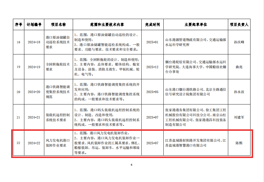 根據(jù)中國港口協(xié)會中港協(xié)行函〔2024〕30號文件精神,江蘇鹽城港射陽港開發(fā)集團(tuán)有限公司申報(bào)的《風(fēng)力發(fā)電機(jī)港口裝卸作業(yè)要求》成功通過《2024年度中國港口協(xié)會團(tuán)體標(biāo)準(zhǔn)化計(jì)劃》立項(xiàng),這標(biāo)志著鹽城港港口風(fēng)力發(fā)電機(jī)裝卸作業(yè)將作為行業(yè)標(biāo)準(zhǔn)在港口作業(yè)行業(yè)進(jìn)行推廣。
