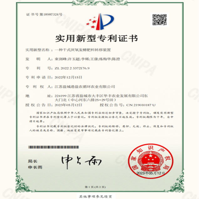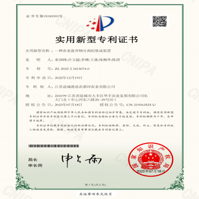 扎實推進科研創(chuàng)新,不斷將理論研究成果轉化到實際生產過程與產品中,截至目前,鹽農循環(huán)農業(yè)先后取得了3個肥料登記證,獲得自主研發(fā)專利24項(其中發(fā)明專利4項),另外還有15項專利已受理。率先使用新型機械沼液還田機,實現(xiàn)沼液在旱作物大面積推廣施用,替代70%以上化肥用量,將理論轉化為實際。“沼液在稻麥輪作上施用技術規(guī)范”地方標準成功立項,為沼液推廣應用打下堅定的基礎。 申報成功國家高新技術企業(yè)、江蘇省農業(yè)科技型企業(yè)、江蘇省三星上云企業(yè)、市級農業(yè)產業(yè)化龍頭企業(yè)等稱號。與揚州大學等高校共同申報的2022年江蘇省碳達峰碳中和科技創(chuàng)新專項資金項目-沿海灘涂農田生態(tài)碳匯能力提升模式構建和試驗示范基地建設也正在按進度穩(wěn)步推進。