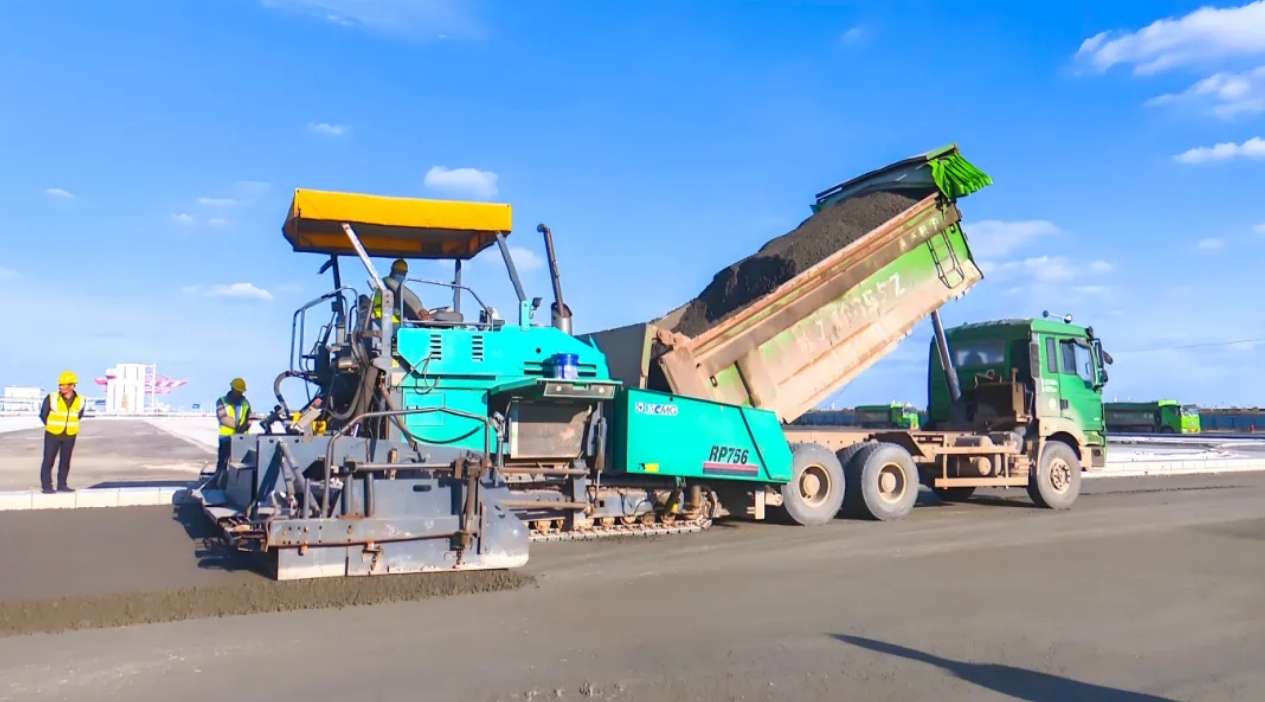 運輸車正繁忙地將水泥穩(wěn)定碎石