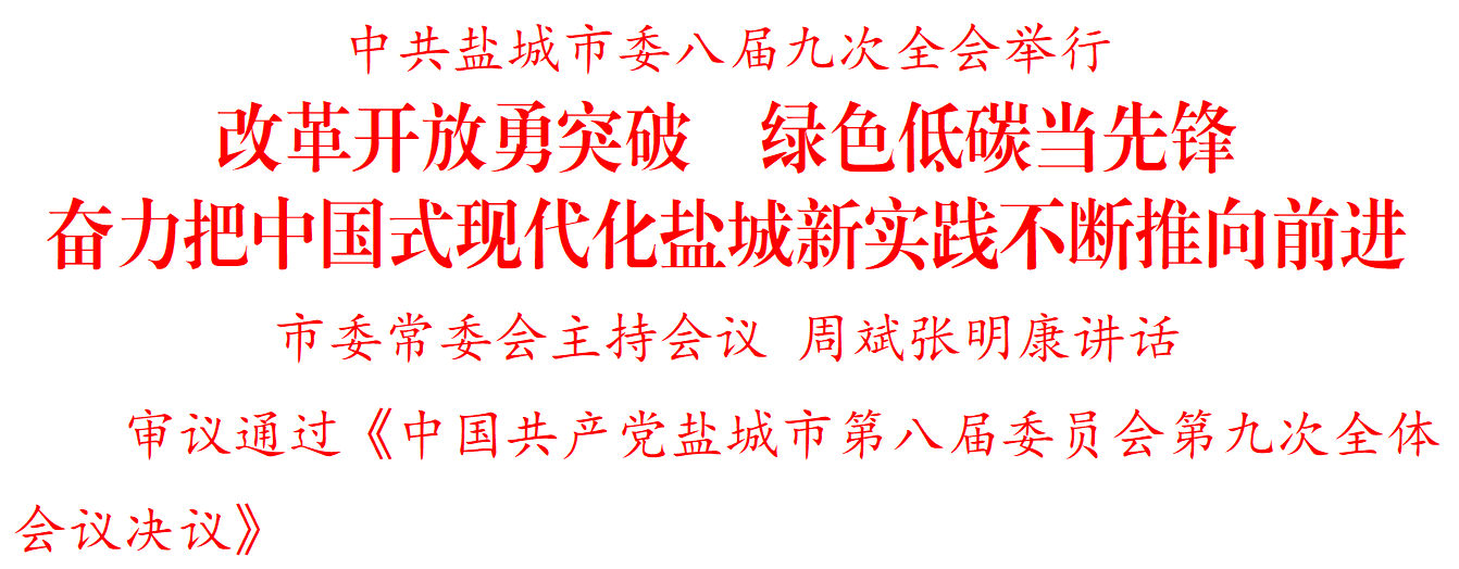 12月29日,中國(guó)共產(chǎn)黨鹽城市第八屆委員會(huì)第九次全體會(huì)議舉行。全會(huì)堅(jiān)持以習(xí)近平新時(shí)代中國(guó)特色社會(huì)主義思想為指導(dǎo),深入貫徹落實(shí)黨的二十屆三中全會(huì)、中央經(jīng)濟(jì)工作會(huì)議和省委十四屆八次全會(huì)、省委經(jīng)濟(jì)工作會(huì)議精神,總結(jié)今年工作,部署明年任務(wù),動(dòng)員全市上下進(jìn)一步全面深化改革開放,堅(jiān)定不移推動(dòng)綠色低碳發(fā)展,高質(zhì)量完成“十四五”規(guī)劃目標(biāo)任務(wù),奮力把中國(guó)式現(xiàn)代化鹽城新實(shí)踐不斷推向前進(jìn)。
