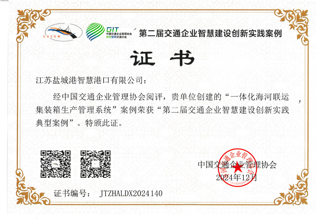 近日,從全國第二屆交通企業(yè)智慧建設(shè)創(chuàng)新實踐案例發(fā)布會傳來喜訊,鹽城港集團“一體化海河聯(lián)運集裝箱生產(chǎn)管理系統(tǒng)”“鹽城電子口岸平臺”兩項成果入選第二屆交通企業(yè)智慧建設(shè)創(chuàng)新實踐-典型案例。