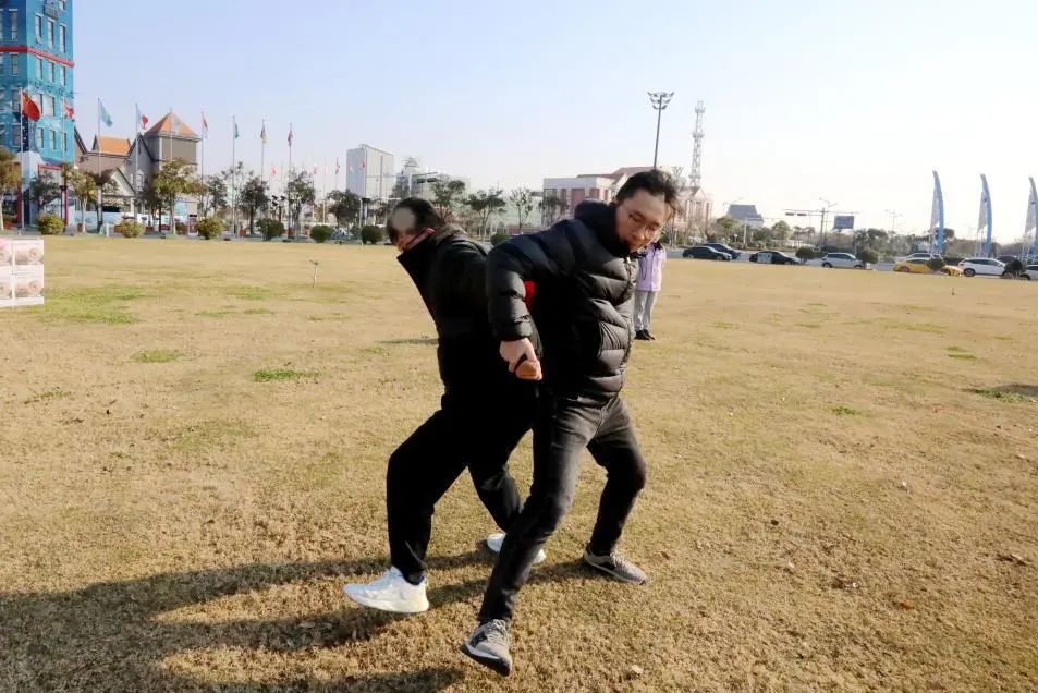 隨著擊掌聲的響起,參加同心協力(背對背夾球跑)環節的選手們一個吹氣球,一個加油鼓勁,速度將氣球夾在中間跑向前方,并在終點處將互相配合將氣球壓爆。