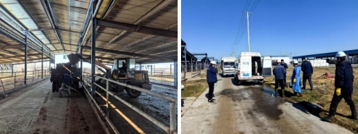 棚舍內(nèi),裝載機(jī)往來穿梭,轟鳴聲不斷。工作人員加班加點(diǎn)清理牛糞并運(yùn)往糞污處理區(qū),對牛棚進(jìn)行全面清掃。身著防護(hù)服的消毒人員,手持專業(yè)消殺設(shè)備,對場地、棚舍、通道以及各類設(shè)備進(jìn)行全方位消毒,為種牛營造一個(gè)安全、衛(wèi)生的環(huán)境。