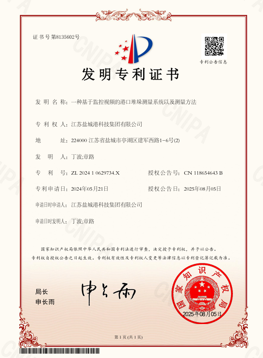 近日,集團科技創新課題《基于港區視頻的港口堆垛智能化測量作業系統》成功斬獲雙項核心知識產權——《一種基于視頻監控的港口堆垛測量系統及測量方法》發明專利與《散貨堆垛三維重建可視化系統》計算機軟件著作權,同時系統已在響水港區散雜貨堆場實現試點應用落地,不僅驗證了技術的可行性與穩定性,更標志著集團“從技術研發到成果轉化”的創新鏈路貫通,港口智能化升級邁出實質性步伐。