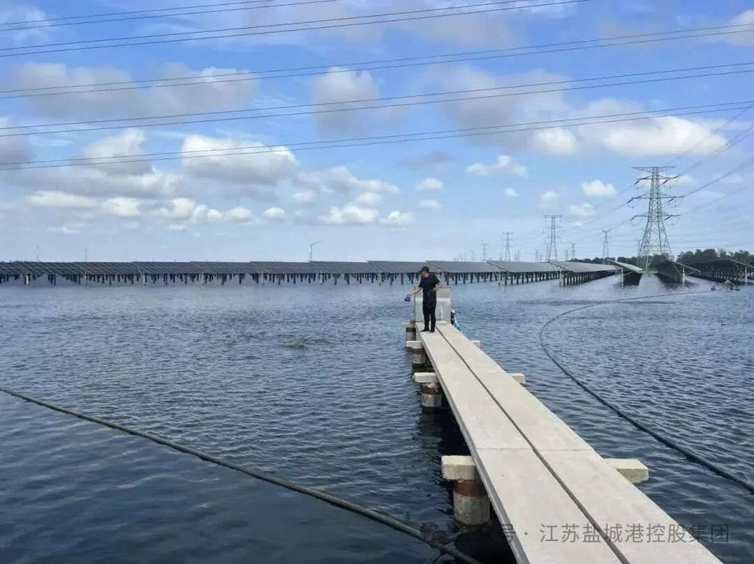 在鹽農(nóng)華豐7956畝的水域上,光伏板整齊排列如藍色海洋,水下魚蝦游弋正歡。這個由鹽城港集團與悅達投資聯(lián)合打造的項目,以“一地兩用、漁光互補”模式實現(xiàn)“上發(fā)電、下養(yǎng)魚”的生態(tài)奇跡。自2024年10月15日并網(wǎng)運行以來,年均發(fā)電量達4.43億千瓦時,每年可節(jié)約標煤13.34萬噸,減少二氧化碳排放36.65萬噸,提升養(yǎng)殖密度20%。