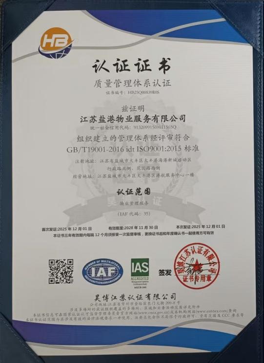 近日,鹽港物業(yè)成功通過ISO系列管理體系認(rèn)證,獲得誠(chéng)信管理體系、環(huán)境管理體系、職業(yè)健康安全管理體系、質(zhì)量管理體系、企業(yè)社會(huì)責(zé)任管理體系五項(xiàng)核心認(rèn)證證書,標(biāo)志著鹽港物業(yè)在規(guī)范化運(yùn)營(yíng)、服務(wù)品質(zhì)提升、社會(huì)責(zé)任踐行等多個(gè)維度實(shí)現(xiàn)全面升級(jí),正式邁入標(biāo)準(zhǔn)化、精細(xì)化管理的新階段。