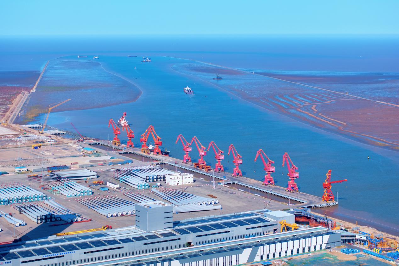 助力風電產業“乘風”出海。 面對風電葉片日益大型化的挑戰,集團各港區前瞻布局,系統提升作業能力。大豐港成功完成國內最長147米風電葉片裝卸作業;濱海港實現首單風電葉片的模具出運;響水港創新推出光伏支架“場地租賃+現場組裝+碼頭裝卸”一站式服務;射陽港圓滿完成金風科技“江蘇區域海上項目”、遠景能源“印度項目”等重點風電設備出運任務。依托運維基地建設,積極探索全鏈條服務能力,提供“從出廠到出港”全過程物流、“從部件到整機”全環節裝配、“從基地到風場”全周期運維服務,構建集專業吊裝碼頭、裝配場地與運維基地于一體的全鏈條產業生態。“十四五”期間,風電設備吞吐量累計近1.3億噸,位列全國風電裝備“三大基本港”。