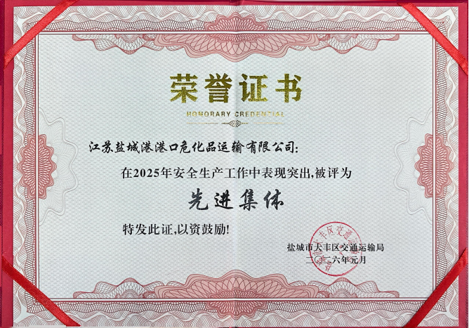 近日,鹽城港港口危化品運輸有限公司憑借扎實有效的安全生產管理工作、突出的安全風險防控成效,榮獲大豐區交通局授予的“2025年安全生產工作先進集體”榮譽稱號,用責任與擔當樹立了危化品行業安全規范經營的標桿。
