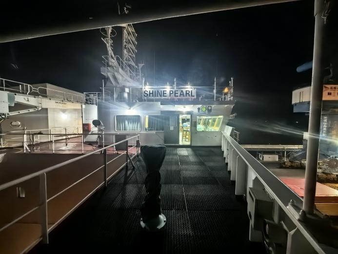 三時(shí)三十分,引航員準(zhǔn)時(shí)登輪。登輪后半小時(shí),海浪如預(yù)判般逐漸消退,引航員順勢(shì)而為,巧妙利用潮汐變化,通過(guò)穩(wěn)健指揮與精準(zhǔn)操縱,在涌浪間隙中穩(wěn)控巨輪航向。歷時(shí)一個(gè)半小時(shí),“閃耀珍珠”輪最終順利靠泊,全程未受風(fēng)浪影響。“你們的業(yè)務(wù)水平是一流的!感謝克服不良海況引領(lǐng)我輪準(zhǔn)時(shí)靠泊!”船長(zhǎng)由衷贊嘆。這聲感謝,是對(duì)引航員深夜堅(jiān)守的最好回應(yīng)。